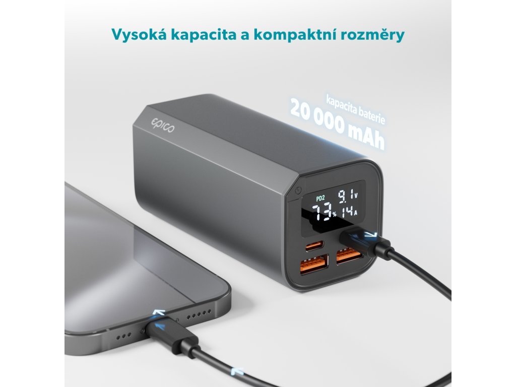 Vysoká kapacita: Baterie s kapacitou 20 000 mAh poskytuje dostatek energie pro opakované nabití smartphonu a tabletu, nebo udržení notebooku v chodu na cestách.