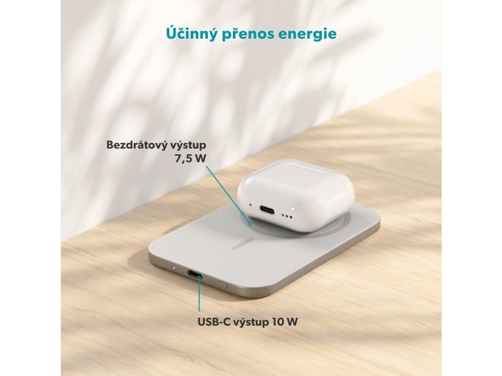 Hliníkové tělo powerbanky nejen působí elegantně, ale zároveň pomáhá efektivně odvádět teplo a udržovat stabilní výkon. Přední strana z tekutého silikonu zajišťuje lepší přilnavost k zádům telefonu a podporuje účinnější přenos energie. Bezdrátový výstup s výkonem až 7,5 W doplňuje možnost nabíjení přes USB-C s výkonem až 10 W. O bezstarostné používání se stará šestinásobná ochrana proti přepětí, přebití, přetížení, nadměrnému vybití, nadproudu a zkratu, takže se můžete spolehnout na bezpečné nabíjení doma i na cestách. Součástí balení je také praktický 0,3m USB-C na USB-C kabel.