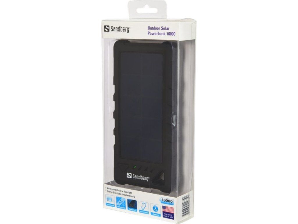 Sandberg Outdoor Solar Powerbank 16000 je přenosná baterie, která se nabíjí přes USB port nebo vestavěné solární články.