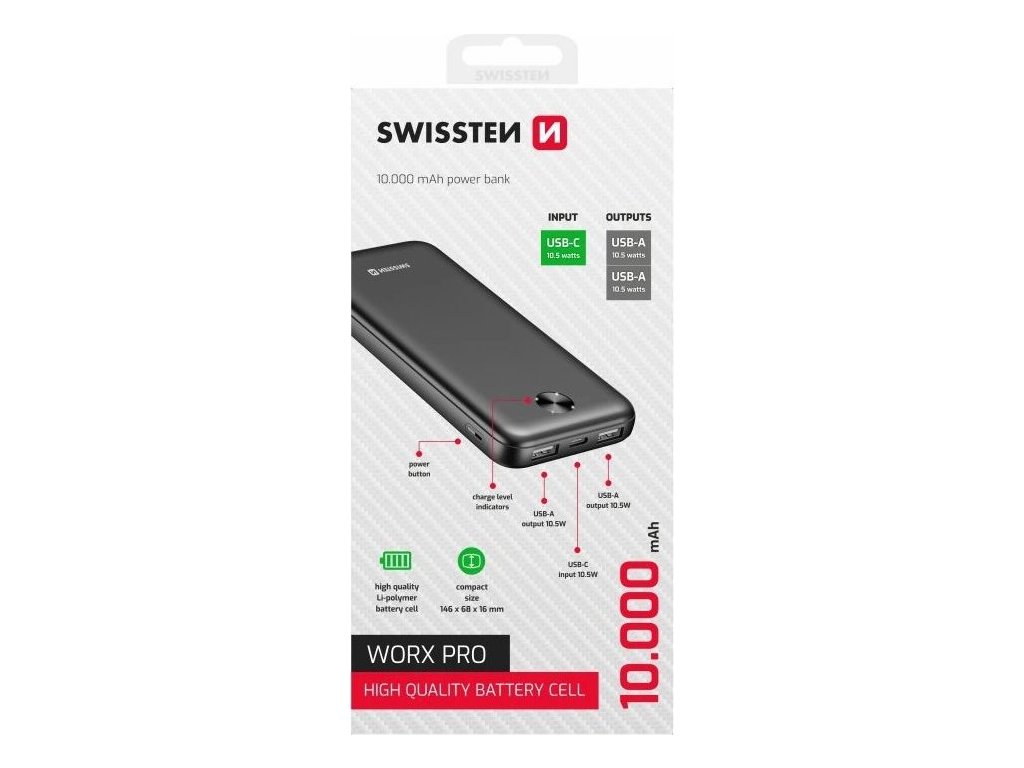 Powerbanka SWISSTEN WORX PRO disponuje kapacitou 10 000 mAh, díky čemuž je ideální pro nabití smartphonu, tabletu, případně opakované nabití drobné nositelné elektroniky, jakou jsou fitness náramky, chytré hodinky, Bluetooth sluchátka apod. Navíc je vybavena dvojicí USB portů, a tak vám umožní nabíjení dvou zařízení najednou. Konstrukce je zhotovena z ohnivzdorného plastu, což zajišťuje odolnost a bezpečnost při manipulaci a častém používání.