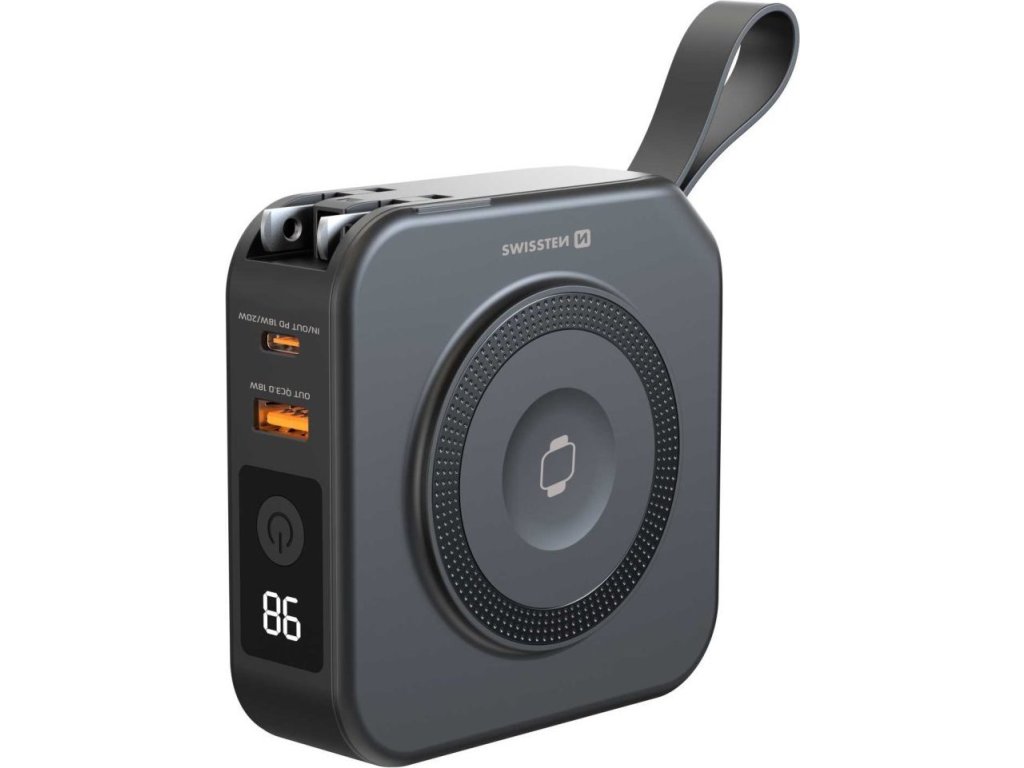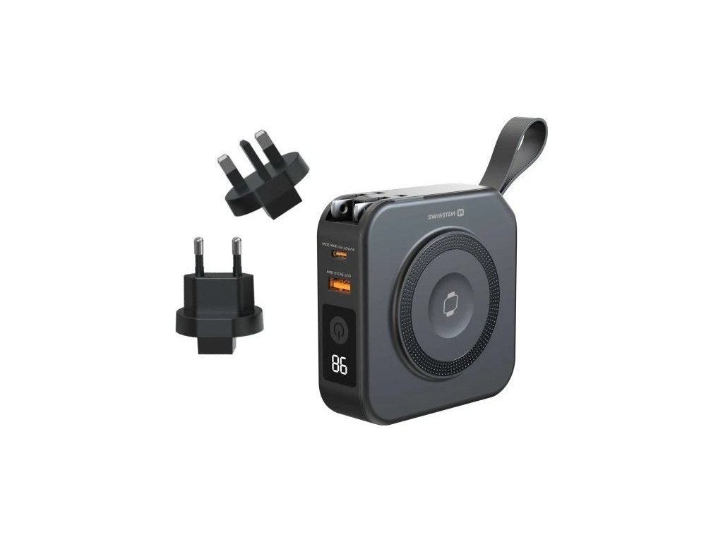 Powerbanka SWISSTEN All-in-one pro nabíjení zařízení kdykoli a kdekoli – doslova. Tento model disponuje vyměnitelnými vidlicemi, díky čemuž je použitelná po celém světě. Ve spojení s 20W nabíjením představuje univerzální řešení pro rychlé napájení na cestách i při každodenním použití. Zabudované nabíjecí konektory a bezdrátové MagSafe nabíjení podporují maximální pohodlí.