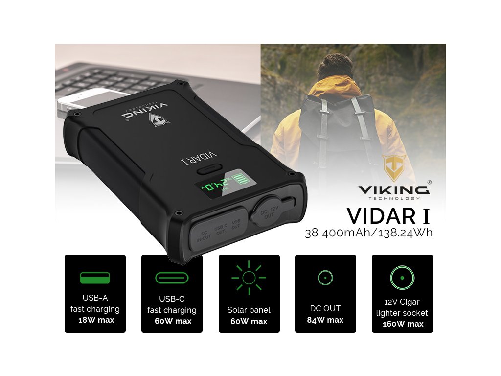 Outdoorová powerbanka Viking VIDAR I • Kapacita: 38400mAh/138Wh • Maximální výkon: 160W • Široká škála vstupů a výstupů (USB-A, USB-C, Cigaretová zásuvka, DC-jack) • Možnost solárního napájení • Funkce Pass-Through • Odolnost IP65