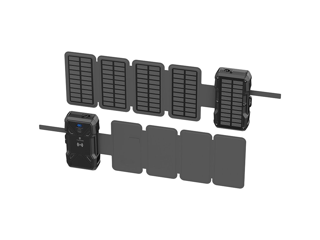 Solární powerbanka • Kapacita 30000mAh (111Wh) • podpora rychlonabíjení QC3.0 a Power Delivery • USB-C vstup až PD18W • USB-C výstup (PD20W max.) • 2 x USB-A výstup (QC22.5W max.) bezdrátové wireless nabíjení 15W max. • 5 solárních panelů 8W max • IP54 • LED svítilna