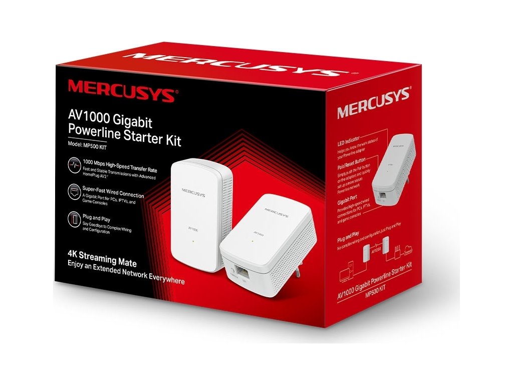 Mercusys MP500 AV1000 Gigabit Powerline Starter Kit. Sada MP500 přenáší síťová data prostřednictvím stávajících elektrických obvodů a vyhýbá se negativním vlivům překážek v síti. Užijte si stabilní rozšířenou síť s přenosovou vzdáleností až 300 metrů (na stejném elektrickém obvodu). Perfektní pro streamování 4K, online hry a aplikace náročné na grafiku.
