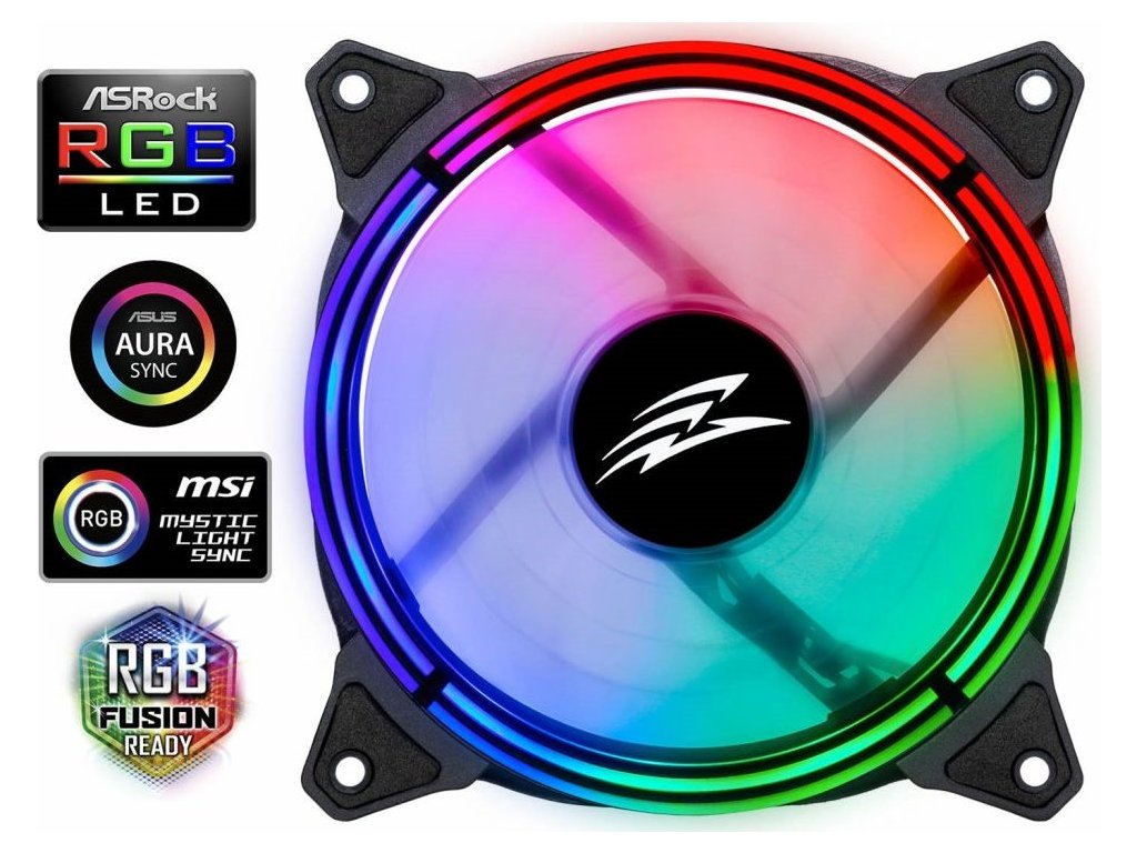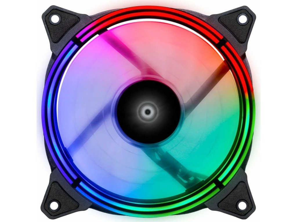 RGB LED ventilátor typu rainbow s LED diodami umístěnými ve vnějším obvodu, jedná se o tzv. typ ring. Ventilátor umožňuje najednou zobrazit všech sedm barev duhového spektra. Jedná se o kontrolní ventilátor, který je určen pro použití s ventilátorem EVOLVEO 12RS. LED osvětlení je ovládáno pomocí tlačítka reset nebo LED tlačítka na ovládacím panelu skříně nebo připojením přiloženého ARGB kabelu k základní desce.