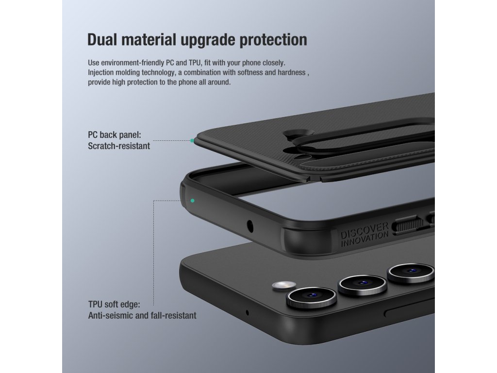Skládá se z tvrdého a odolného plastu na zadní straně a TPU měkkého plastu na bocích.
