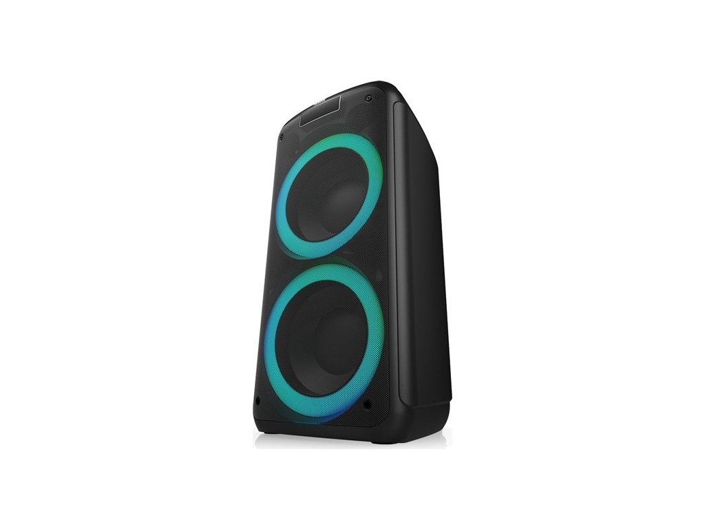 Party reproduktor, RMS výkon 200 W, impedance 4 ohm, frekvenční rozsah 50 Hz–18 kHz, citlivost 88 dB, MaxBass, výdrž 8 hodin, bezdrátová mikrofon, TWS