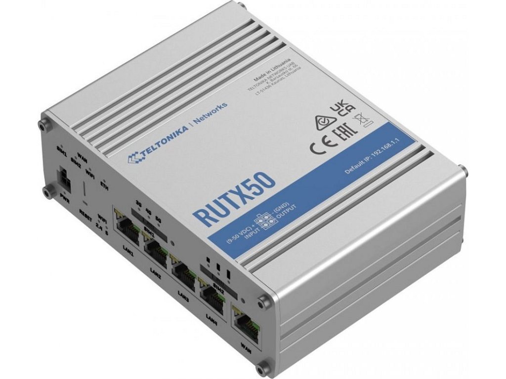 Teltonika RUTX50Průmyslový 5G router s Wi-Fi pro vysokorychlostní a datově náročné aplikace. Je vybaven 2× SIM sloty, 5× GbE RJ-45 porty a USB portem. Tento router je ideální pro pokročilé průmyslové a podnikové aplikace. Výkon technologie 5G v kombinaci s širokou škálou rozhraní a průmyslovými hardwarovými funkcemi zajišťuje přizpůsobivost pro budoucí upgrade a rozšíření.