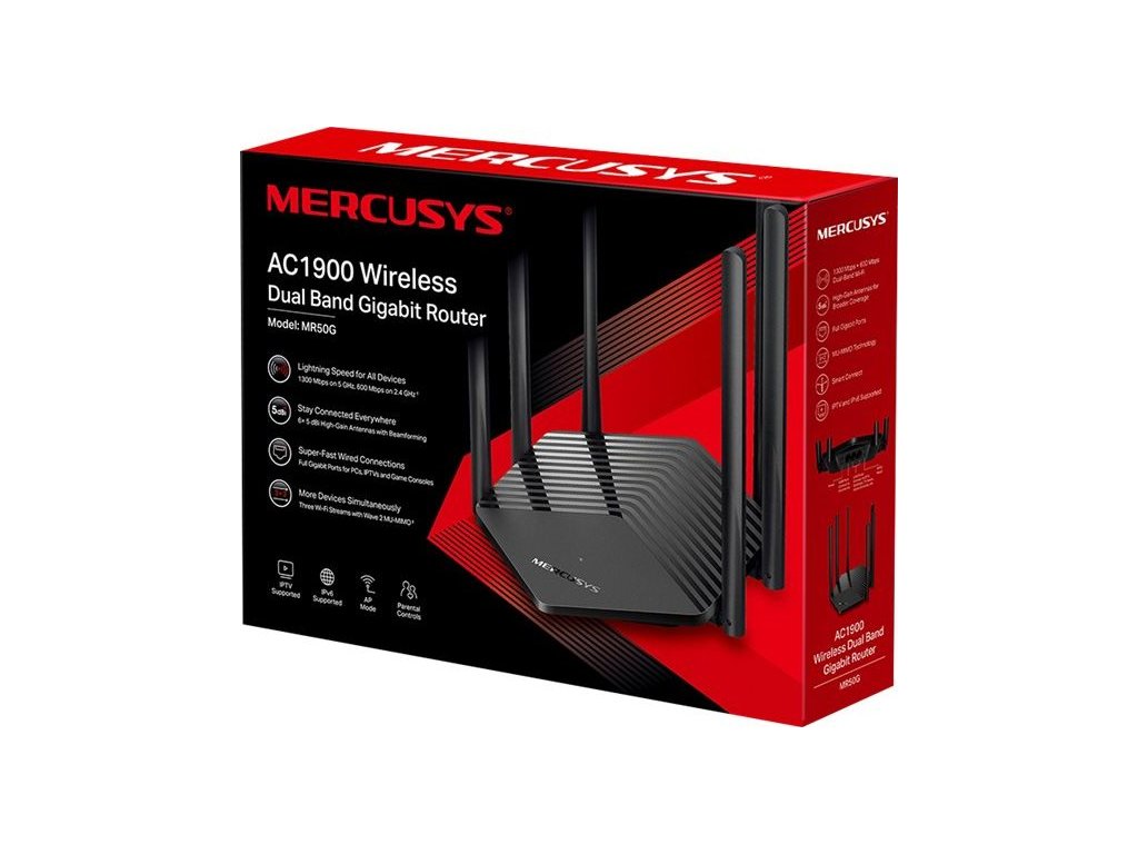 Mercusys MR50G AC1900 Wireless Dual Band Gigabit Router. Vzhledem k tomu, že se širokopásmové služby neustále vyvíjejí, je třeba upgradovat také váš směrovač WiFi. Nejnovější hlavní směrovač je připraven pro vás. V souladu s výkonným standardem 802.11ac poskytuje MR50G rychlosti až 1900 Mb/s (600 Mb/s na 2,4 GHz, 1300 Mb/s na 5 GHz), aby všechny vaše počítače, smartphony a TV fungovaly co nejrychleji. Užijte si nepřetržitou zábavu a plynulé streamování 4K bez jakéhokoli zpoždění.