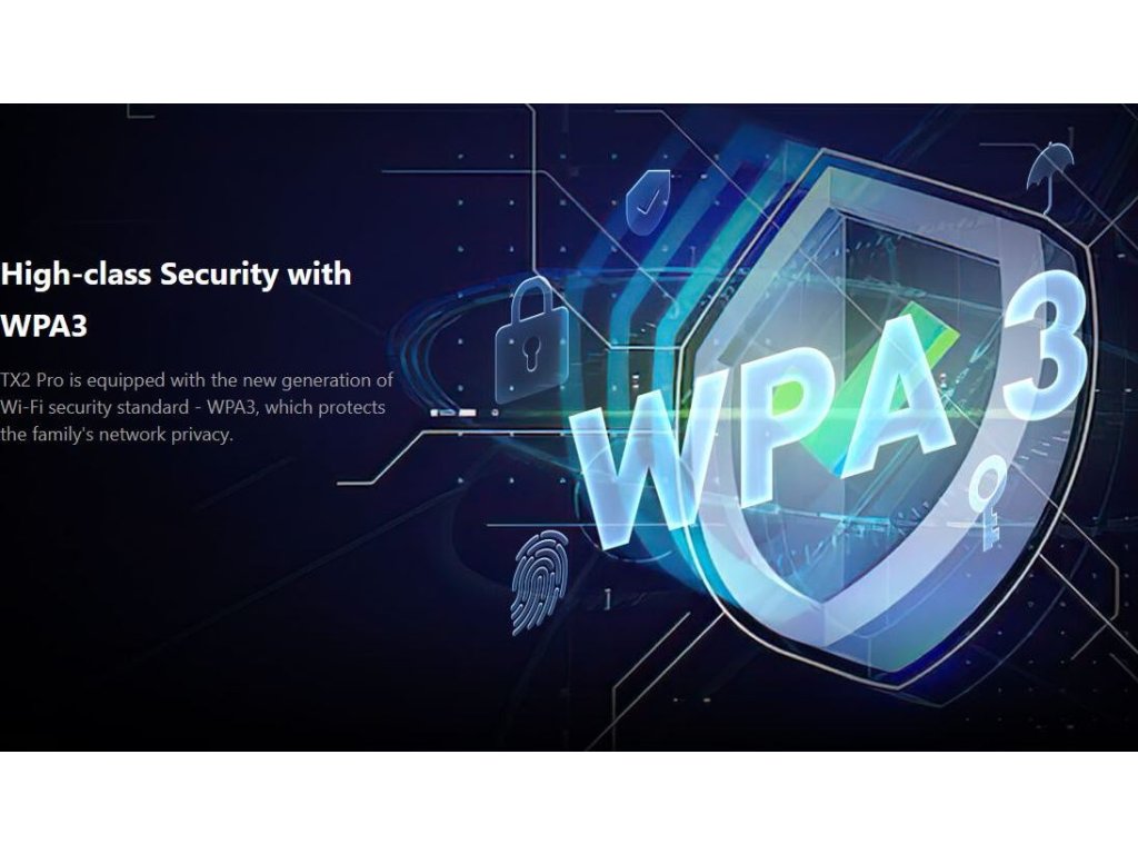 TX2 Pro podporuje velké možnosti zabezpečení. Nejnovější WPA3, ale také starší verze WPA, WPA2, WPA/WPA2-PSK a šifrováním TKIP nebo AES. Tato nabídka je navíc doplněna a WPS (Wi-Fi Protected Setup). Systém WPS umožňuje připojení pomocí stisknutí tlačítka na routeru a na klientské stanici, router tak automaticky nastaví spojení zabezpečené pomocí nejvyššího zabezpečení, které koncové zařízení podporuje a není nutné znát heslo do Wi-Fi sítě. Tento způsob je nejen rychlý a jednoduchý, ale také bezpečný. Router také má možnost nastavení DDNS a to pro No-ip, 88ip, Oray.com, DynDNS. Dále funkce filtrace zařízení v síti "Client Filter" a také rodičovskou kontrolu s podporou zakázaných nebo jen povolených webů "Parental Control(support black list and white list)", a vzdálenou správu "Remote Web Management". Router obsahuje firewall pro odrazení útoků: UDP Flood Attack, TCP Flood Attack, ICMP Flood Attack, WAN Ping from Internet.