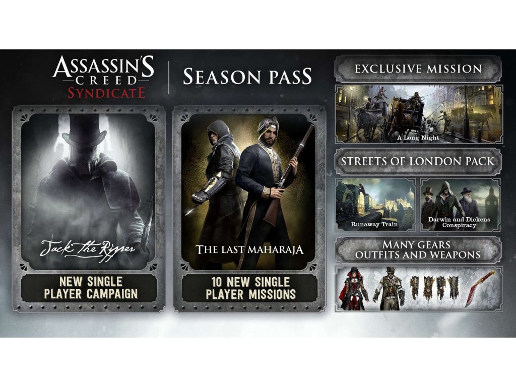 Season Pass pro Assassin’s Creed Syndicate vám zajistí přístup k výběru toho nejlepšího dodatečného obsahu a exkluzivnímherním přednostem: