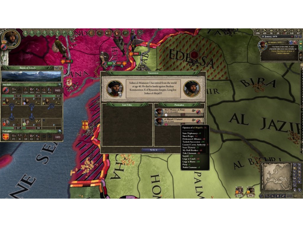 Crusader Kings II: Sword of Islam, přidává do hry Muslimské vládce. Pokud za něbudete hrát můžete vyzkoušet, jaké je tomít 4 manželky. VypnutoVynechat z LightBoxu Není vyplněn Alternativní text k fotografii! Vyžaduje základní hru CrusaderKings II (verzi Steam).První datadisk,Crusader Kings II: Sword of Islam, přidává do hry Muslimské vládce. Pokud za něbudete hrát můžete vyzkoušet, jaké je tomít 4 manželky. Udržujte v rovnováze vznešenost a nenasytnost díky novému systému Muslim Dynasty Decadence.Datadisk přináší více než 20 nových možností a upravené uživatelské rozhraní pro muslimské panovníky.O čem je Crusader Kings IIStředověká Evropa je v chaosu. Je potřeba silného krále, který sjednotí roztříštěné státy. Císař bojuje s papežem. Svatý otecvyhlásí Svatou válku za osvobození Svaté země.