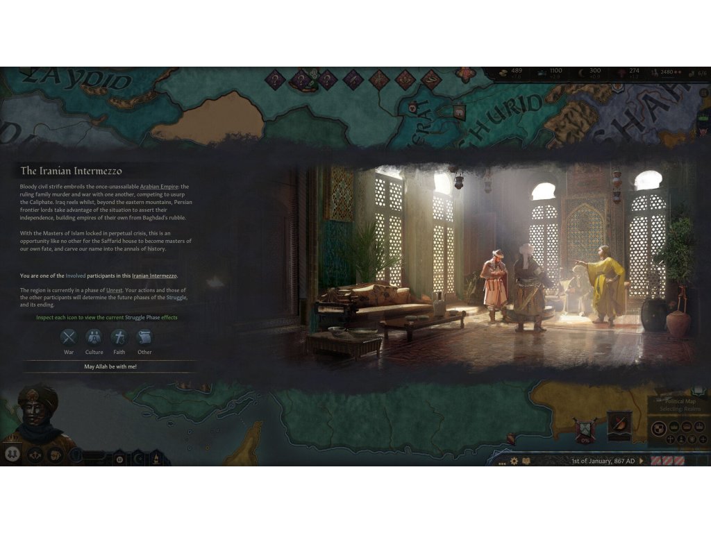 Hra Legacy of Persia, inspirovaná historickým pádem Abbásovského chalífátu v 9.století v Anarchii u Sámarry, představuje íránské intermezzo, soupeření o moc vregionu. V návaznosti na systém bojů představený v příchuťovém balíčku Fate of Iberia přidává Legacy of Persia ještě více kulturně důležitých příchutí a změn doříší v regionu.