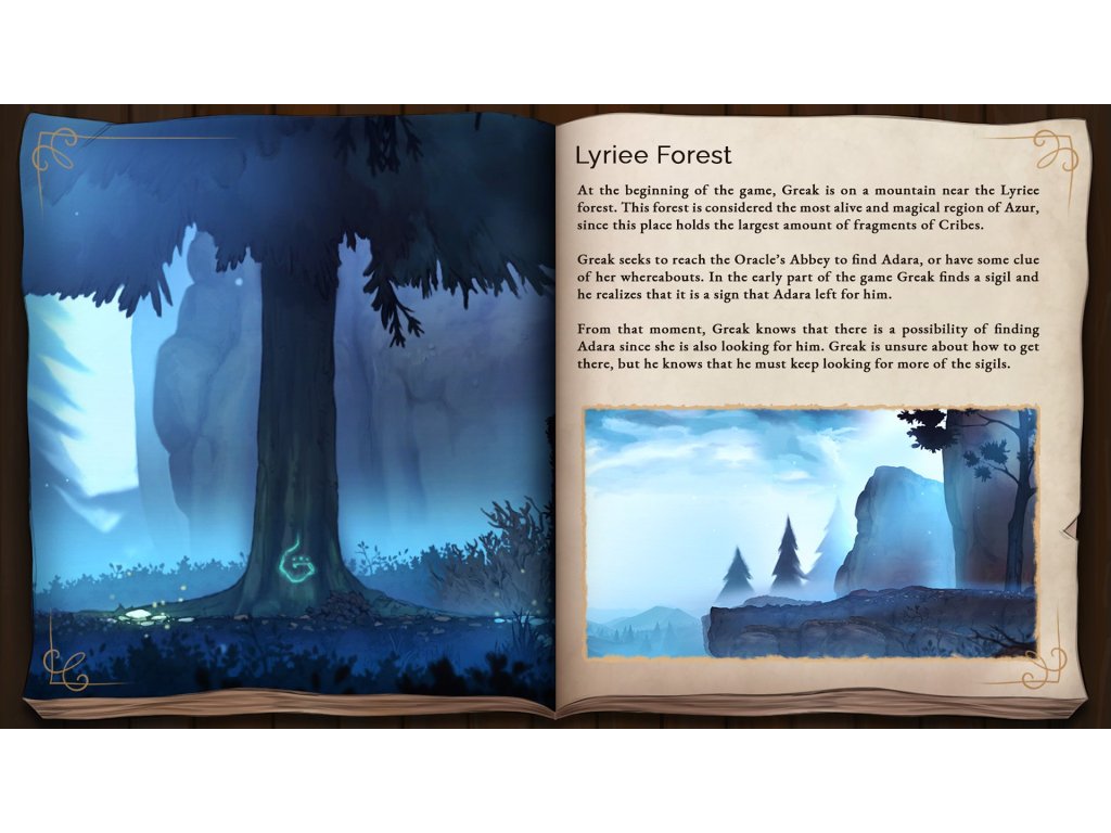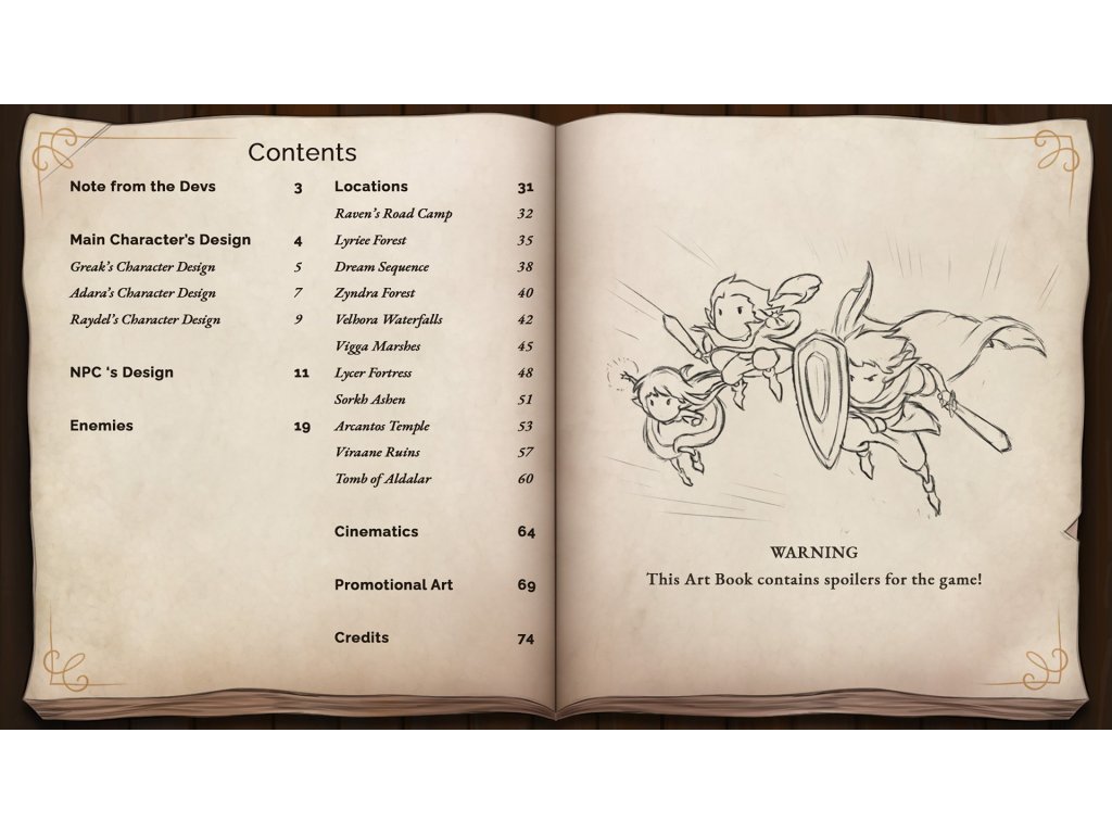 Digitální umělecká kniha Greak: Memoriesof Azur je 73 stránek ručně kreslenýchuměleckých děl shromážděných dohromady za účelem zobrazení postav a světa Greak:Memories of Azur.