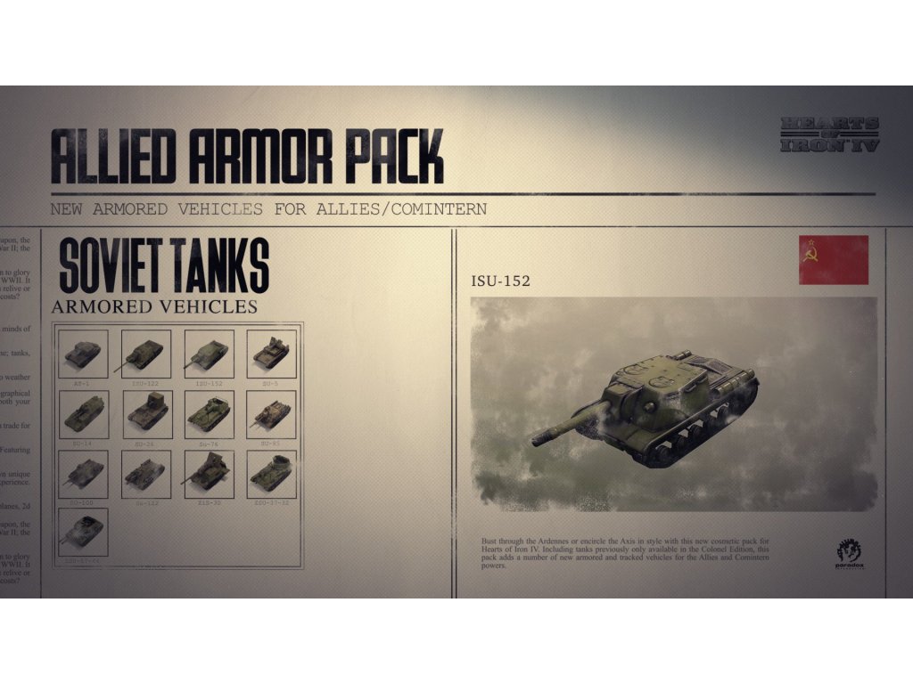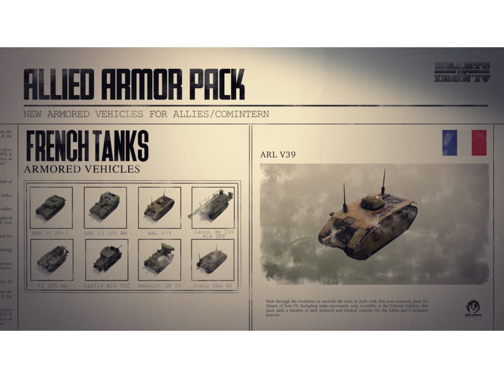 Projděte Ardeny nebo obklopte Axis ve velkém stylu s tímto novým kosmetickým balíčkem pro Hearts of Iron IV. Tento balíček obsahuje tanky, které byly dříve k dispozici pouze v Colonel Edition, a přidává řadu nových obrněných a pásových vozidel pro síly Spojenců a Kominterny.
