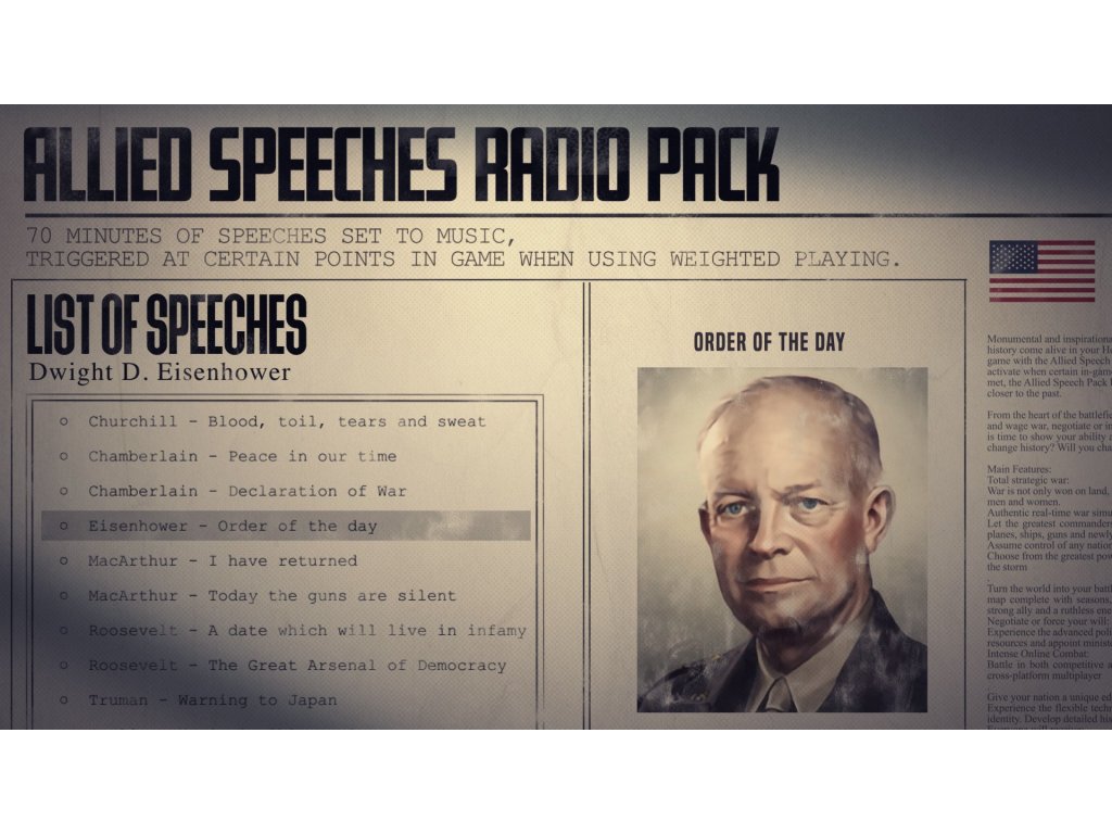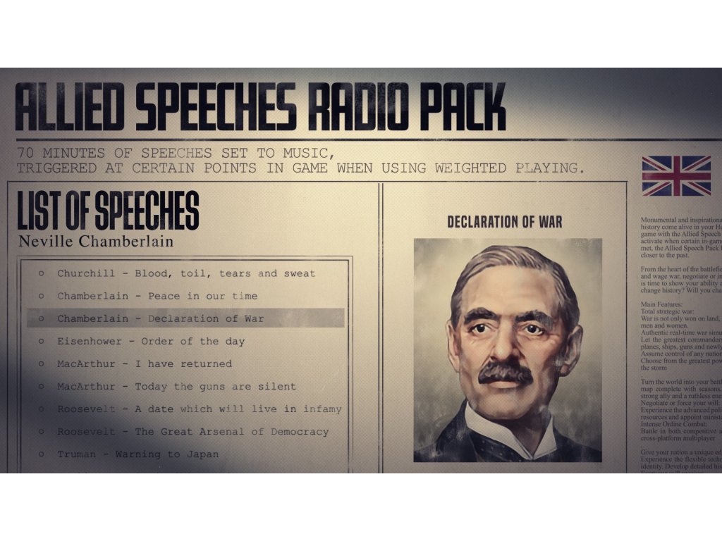Ve hře Hearts of Iron IV s Allied SpeechPack ožívají monumentální a inspirativní momenty z historie. Sada Allied SpeechPack, která se aktivuje při splnění určitých herních podmínek, vás přiblíží minulosti.