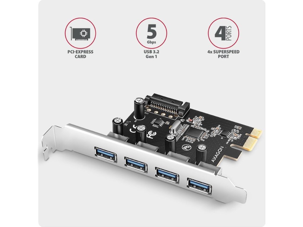 PCI-Express karta AXAGON PCEU-430RS rozšíří stolní počítač o čtyři externí USB-A 5Gbps porty. Karta je navržena pro rychlé a stabilní datové přenosy rychlostí až 5 Gb/s.