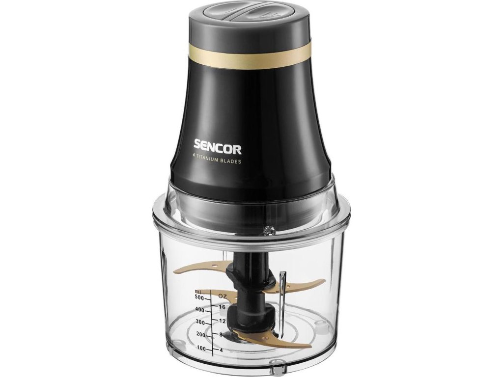 Plastová nádoba s objemom 1 l a 4 nože s vrstvou zlata a titánu na všetky druhy sekania potravín;