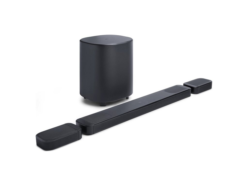 7.1.4 kanálový soundbar s odnímatelnými prostorovými repro, Dolby Atmos a DTS:X. Celkový výkon 960W (soundbar 500W + subwoofer 300W), MultiBeam™ 3.0, Bluetooth 5.3, aplikace JBL ONE.