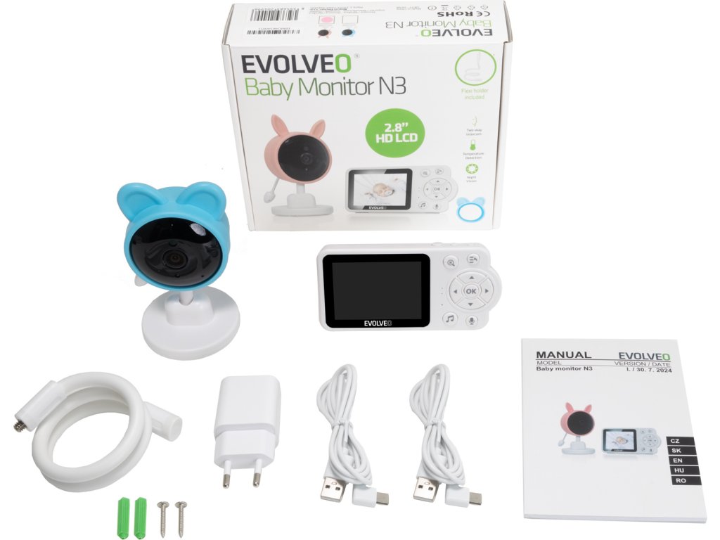 Instalace a používání EVOLVEO Baby Monitor N3 je snadné díky intuitivnímu designu a praktickým doplňkům. Video-chůvička se dodává s adaptérem, stojanem na stůl a flexibilním držákem pro kameru, což umožňuje přizpůsobení přesně podle vašich potřeb. Díky přenosovému dosahu až 300 metrů můžete monitorovat své dítě odkudkoli v domě nebo na zahradě. Přehledné uživatelské rozhraní na 2,8 palcovém TFT displeji zajišťuje, že máte všechny potřebné informace na dosah ruky.