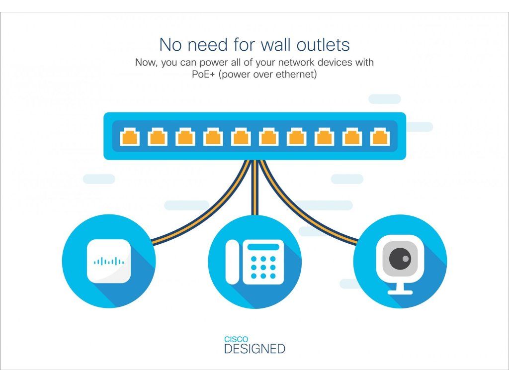 Napájení přes PoE - PoE + zjednodušuje nasazení bezdrátových přístupových bodů, IP telefonie a video dohledu tím, že umožňuje napájení a data přes jediný síťový kabel. Přepínače řady Cisco Business 220 podporují PoE +, který poskytuje až 30 wattů energie na port.