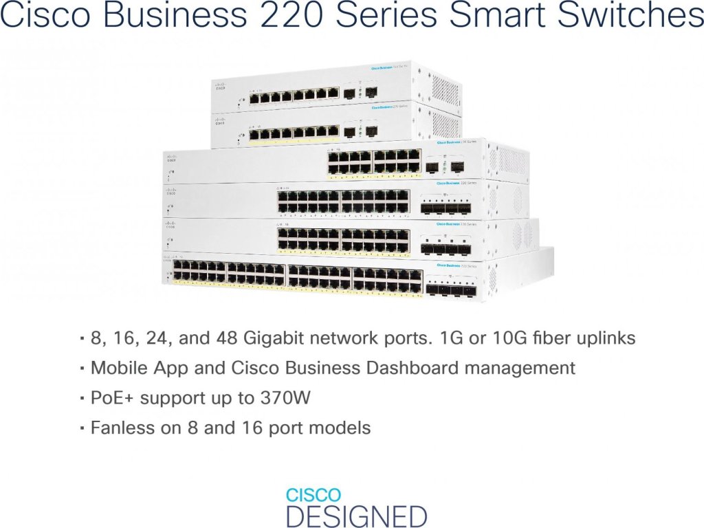 Řada Cisco Business 220 jsou cenově dostupné inteligentní přepínače se snadným použitím, zabezpečením a spolehlivostí pro sítě podnikové třídy. Díky intuitivnímu palubnímu panelu, možnostem napájení přes Ethernet (u vybraných modelů) a přizpůsobitelným funkcím poskytují tyto přepínače spolehlivou obchodní síť v rámci vašich rozpočtových parametrů. Pokud potřebujete síť na špičkové úrovni a cena je nejvyšší prioritou, nabízí řada Cisco Business 220 vynikající řešení.