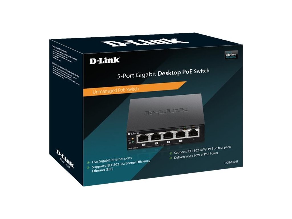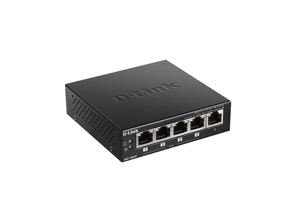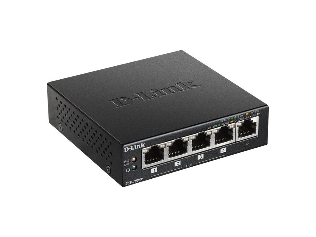D-Link DGS-1005P 5-port Gigabit Desktop PoE+ Switch, 4 porty jsou PoE+, PoE budget 60W