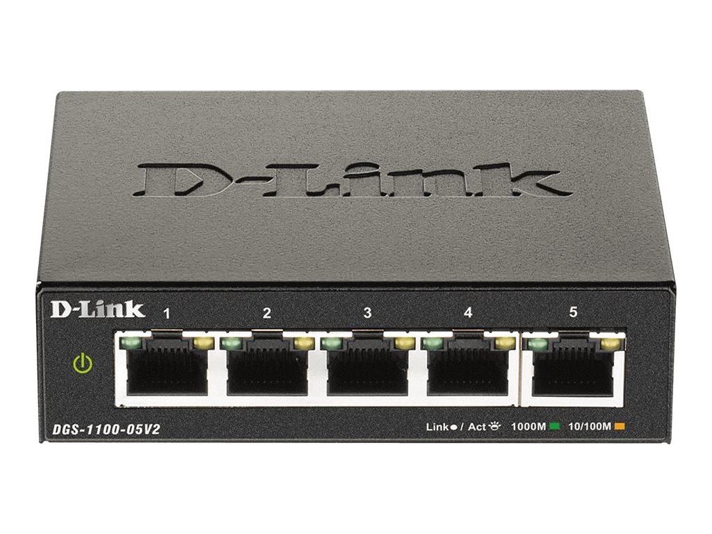 D-Link DGS-1100-05V2 je 5-portový Gigabit Smart řízený přepínač v kompaktním kovovém provedení bez ventilátorů, pro položení na stůl, na poličku nebo montáž na zeď. Nabízí základní sadu L2 funkcí (např. VLAN, QoS, IGMP Snooping, agregace linek) s možností správy z webového rozhraní, pomocí SNMP příkazů nebo nástroje D-Link Network Assistant (DNA). Switch je určený především pro kanceláře (SOHO) a malé a střední podniky (SMB).
