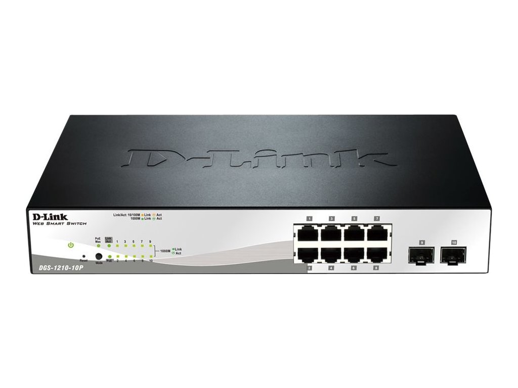 D-Link DGS-1210-10P 10-port Gigabit Smart+ PoE Switch, 8x GbE PoE+, 2x SFP, PoE 65W, fanless