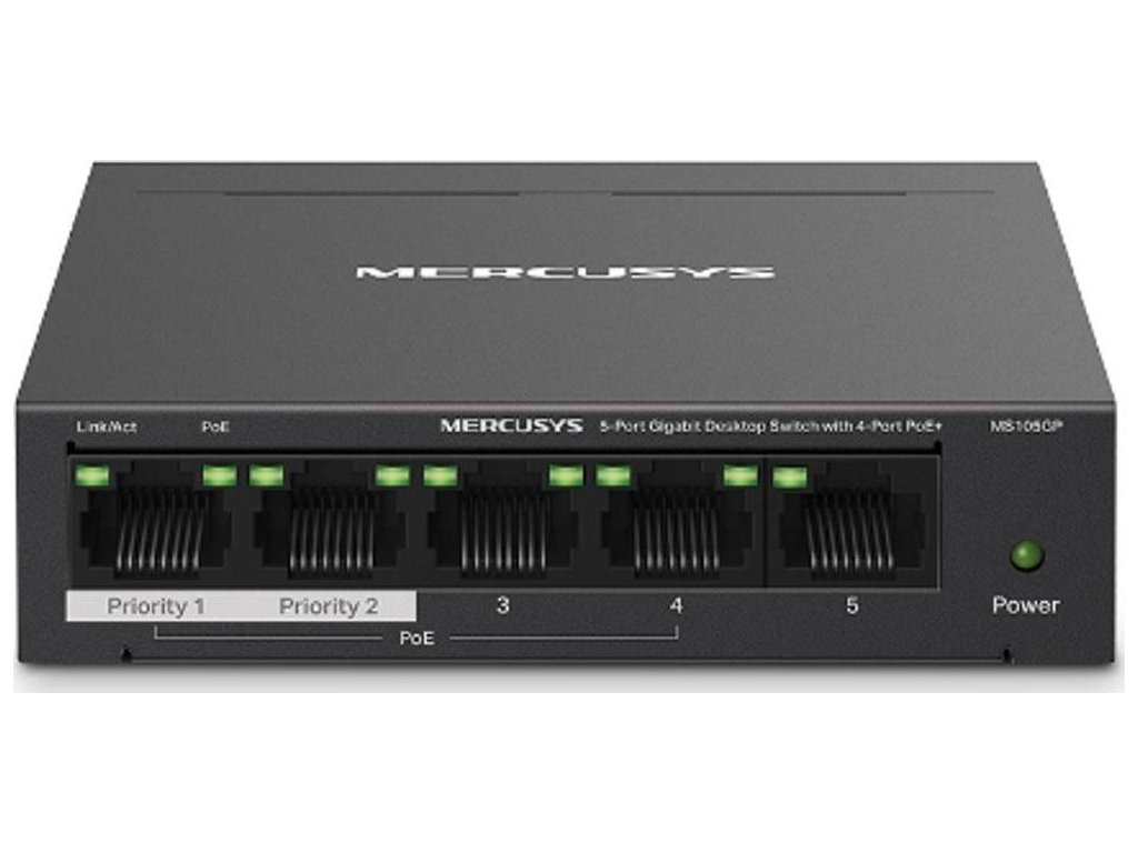 MS105GP 5-Port Gigabit Desktop Switch with 4-Port PoE+ PORT: 4× Gigabit PoE+ Ports, 1× Gigabit Non-PoE PortSPEC: Compatible with 802.3af/at PDs, 65 W PoE Power, Desktop Steel Case, Wall MountingFEATURE: Extend Mode for 250m PoE Transmitting, Priority Port1-2, Isolation Mode, Plug and Play