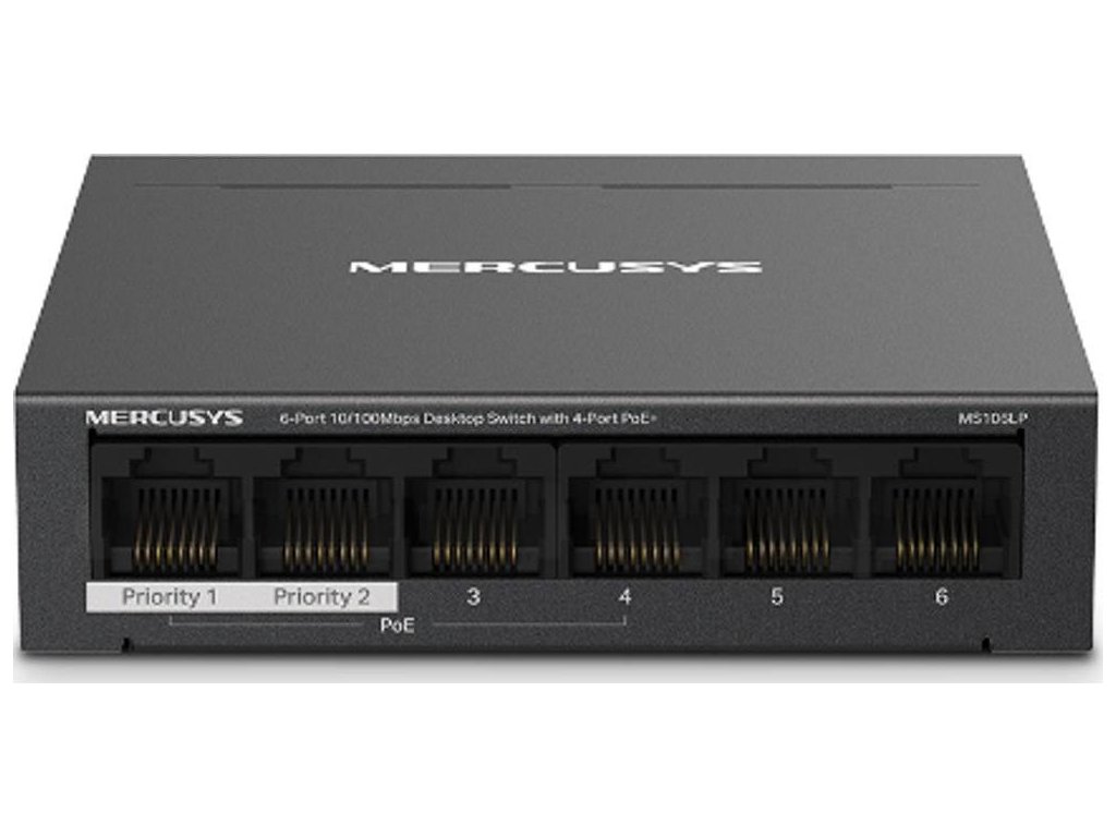 MS106LP 6-Port 10/100 Mbps Desktop Switch with 4-Port PoE+PORT: 4× 10/100 Mbps PoE+ Ports, 2× 10/100 Mbps Non-PoE PortsSPEC: Compatible with 802.3af/at PDs, 40 W PoE Power, Desktop Steel Case, Wall MountingFEATURE: Extend Mode for 250m PoE Transmitting, Priority Port1-2, Isolation Mode, PoE Auto Recovery, Plug and Play