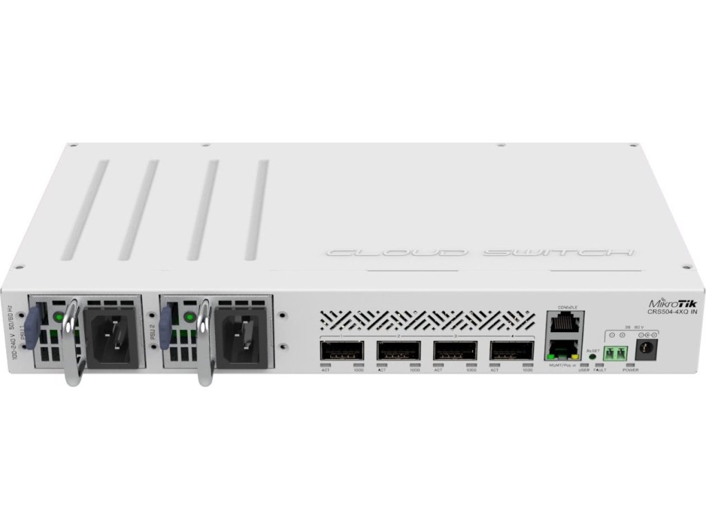 Optický Cloud Router Switch CRS504-4XQ-IN je vhodné 19" rackmount řešení pro vstup do 100 Gbps sítí a jako malý centrální optický switch, který nabízí 4x QSFP28 s rychlostí 100 Gbps, 1x ethernetový port s podporou napájení pasivního PoE a konzolový RJ45 port. Switch lze napájet jak přes dva redundantní Hot-swap zdroje, DC konektor / DC svorkovnici (36 - 57V DC), tak přes ethernetový port podporující pasivní PoE s napětím 43 - 57V DC. Maximální spotřeba zařízení je 41W.
