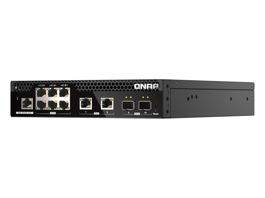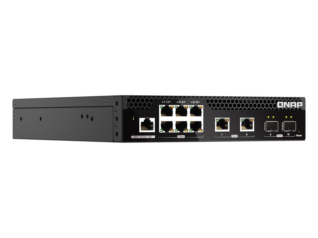 Zařízení QSW-M2106R-2S2T je webově řízený přepínač (switch) úrovně 2 se dvěma porty 10GbE SFP+, dvěma porty 10GbE RJ45 a šesti porty 2,5GbE RJ45. Zařízení QSW-M2106R-2S2T podporuje přepínání a správu sítě úrovně 2 (L2) prostřednictvím uživatelsky vstřícného webového rozhraní, nabízí flexibilní nasazení v hybridních vysokorychlostních síťových prostředích a poskytuje řešení pro správu sítě na základní úrovni, které zvládnou používat i ti, kdo nepatří mezi profesionály v oboru IT. Díky konstrukci s poloviční šířkou mohou být dva QSW-M2106R-2S2T instalovány do 1U rackového prostoru.