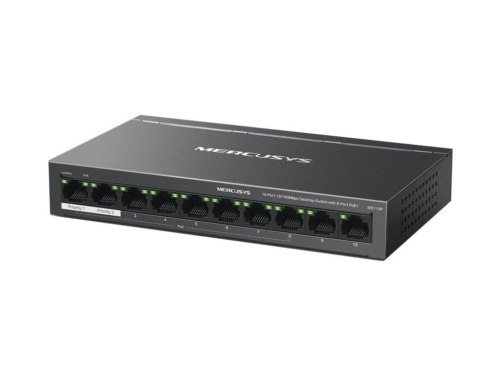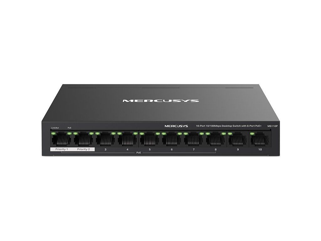 MS110P 10-Port 10/100Mbps Desktop Switch with 8-Port PoE+PORT: 8× 10/100 Mbps PoE+ Ports, 2× 10/100 Mbps Non-PoE PortsSPEC: Compatible with 802.3af/at PDs, 65 W PoE Power, Desktop Steel Case, Wall MountingFEATURE: Extend Mode for 250m PoE Transmitting, Priority Port1-2, Isolation Mode, PoE Auto Recovery, Plug and Play
