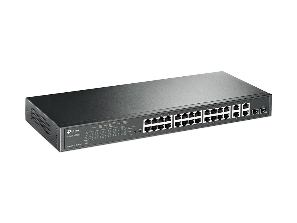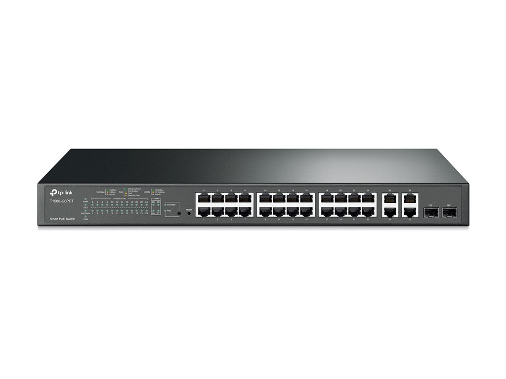 Smart switch TP-Link T1500-28PCT je vybaven 24 porty RJ45 s rychlostí 10/100Mbps, 4 porty RJ45 s rychlostí 10/100/1000Mbps a 2 kombinovanými sloty Gigabit SFP. Všechny porty RJ45 s rychlostí 100 Mb/s podporují standard 802.3at / af (PoE+) s celkovým rozpočtem PoE 192W a užitečnými funkcemi správy napájení PoE. Přepínač poskytuje vysoký výkon, podnikovou úroveň QoS, užitečné bezpečnostní strategie a bohaté funkce správy vrstvy 2.