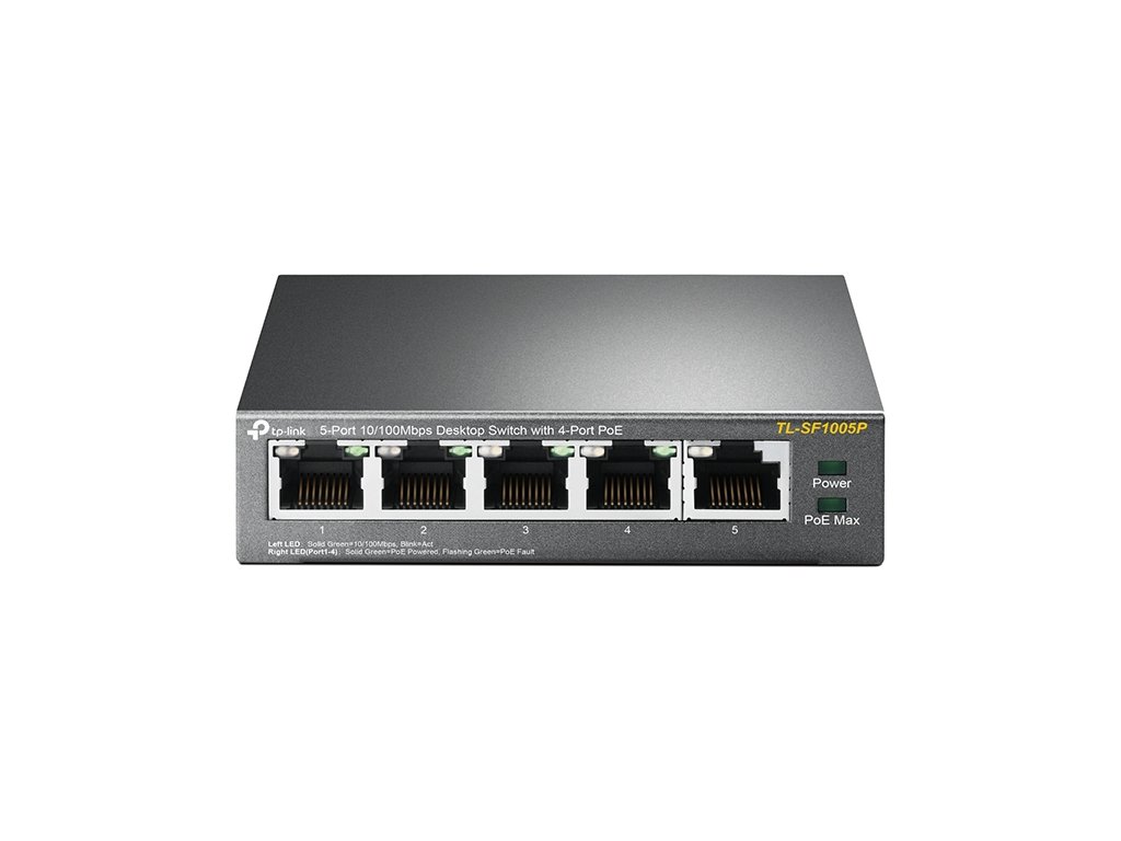 Neřízený switch TL-SF1005P je vybaven pěti porty s rychlostmi přenosu 10/100 Mb/s, který nevyžaduje žádnou konfiguraci a nabízí 4 porty s napájením PoE (Power over Ethernet). Dokáže automaticky detekovat a napájet jakákoli zařízení PD (Powered Devices), která splňují protokol IEEE 802.3af. V tomto provedení je elektrické napájení přenášeno společně s daty přes stejný kabel, což vám umožňuje rozšířit vaši síť i do míst, kde nejsou elektrické přípojky nebo zásuvky, ale kde chcete použít zařízení, jako jsou přístupové body, IP kamery nebo IP telefony, atd.
