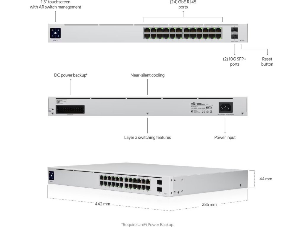 USW-Pro-24 nemá webový management, ale je spravován centrálně pomocí UniFi Network application s podporou mobilní aplikace UniFi a nabízí rozsáhlou sadu pokročilých přepínacích protokolů a funkcí L2, včetně provozního režimu (přepínání, zrcadlení nebo agregace) na port.