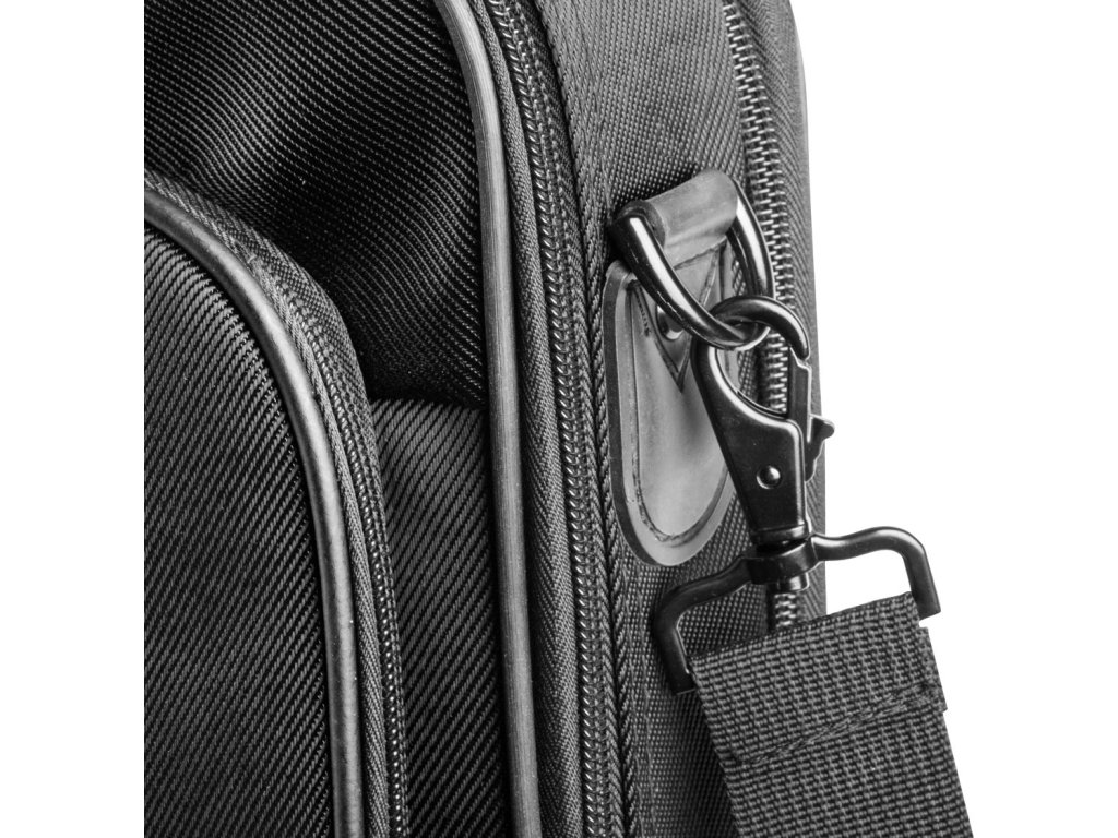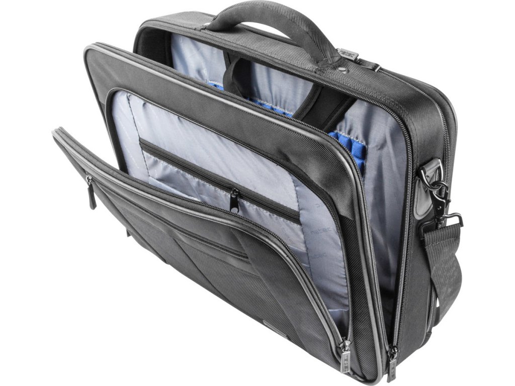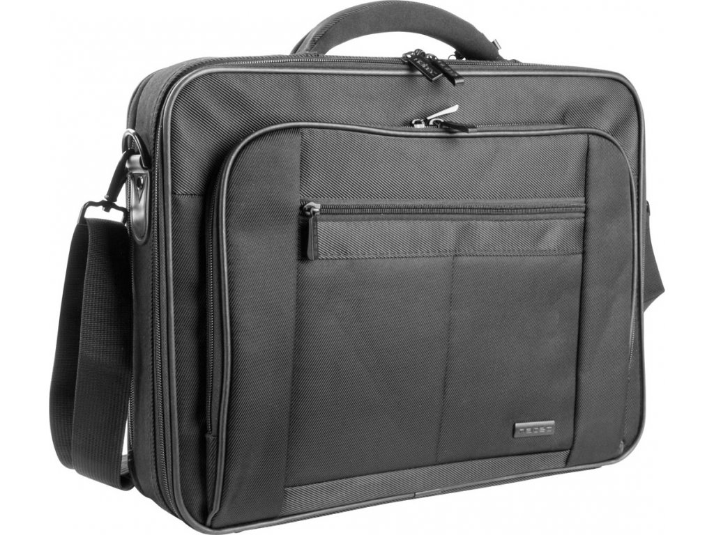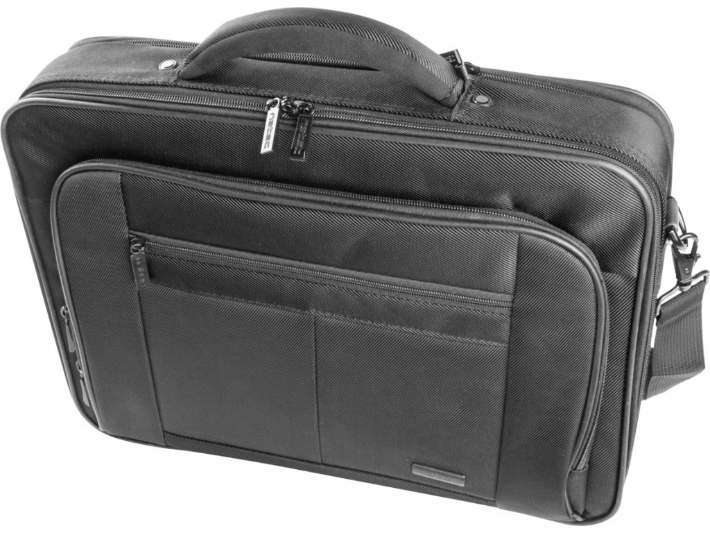 - Tři oddíly: hlavní pro notebook, přední s mnoha kapsami a organizéry, zadní na dokumenty.