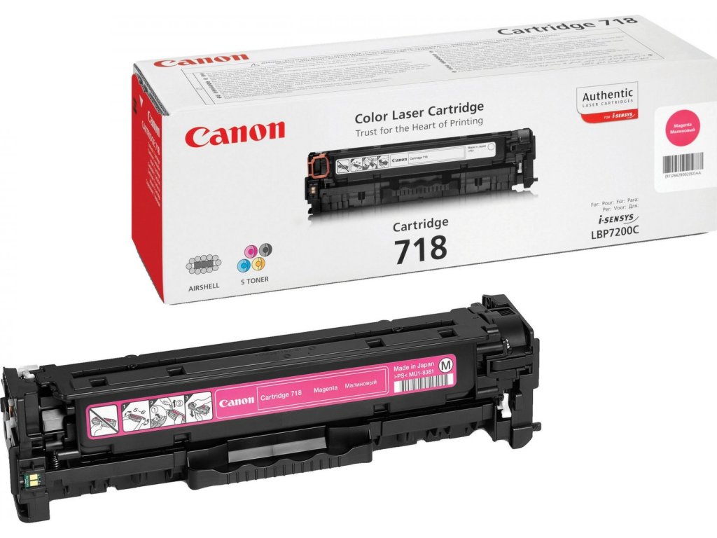 Toner Canon CRG-718 Magenta je určen pro vybrané barevné laserové tiskárny Canon. U tiskáren je zajištěn vysoce kvalitní výstup v rozlišení 600×600 dpi, jež lze zvýšit na ekvivalentní rozlišení 9600×600 dpi pomocí funkce automatického zdokonalení obrazu (AIR – Automatic Image Refinement). Toner CRG-718 magenta obsahuje purpurovou barvu a udává se pro něj výdrž až cca 2900 stránek, při standardním 5% pokrytí.
