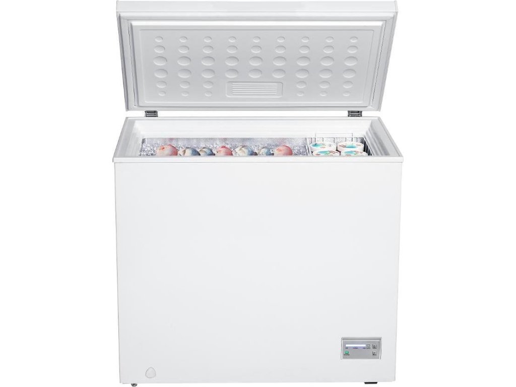 Mraznička truhlicová, trieda E, objem 200 l, elektronický termostat, manuálne odmrazovanie, farba biela, vyjímateľný drôtený kôš, mraziaca kapacita 15,2 kg/24 hod., rozmery vxšxh 84,7x91x55,5 cm