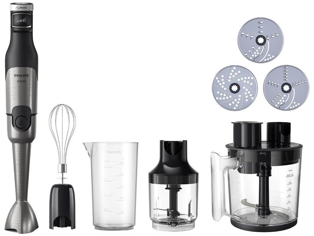 Tyčový mixér so silným motorom s príkonom 1200 W. Rýchle a efektívne mixovanie stlačením jedného tlačidla. Technológia ProMix pre najlepšie výsledky v priebehu pár sekúnd.Turbo funkcia pre extra výkon. Kovová mixovacia noha odnímateľná jedným tlačidlom. Špeciálny tvar krytu čepele zabraňuje rozstrekovaniu a neporiadku pri mixovaní. LED display. Príslušenstvo: transparentná mixovacia nádoba, šľahač, sekáčik, kuchynský robot s 3mi diskami na krájanie, sekanie, strúhanie.