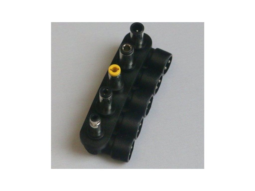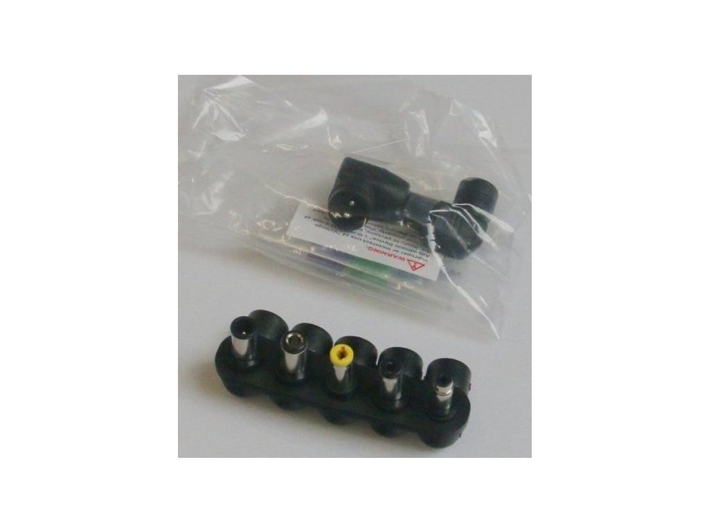 Balení obsahuje sadu 7 výměnných koncovek s různými rozměry a polaritou, které pokrývají nejběžnější typy konektorů používaných u notebooků. Díky tomu lze adaptér využít jako náhradu originálního napájecího zdroje nebo jako druhý adaptér pro cestování.