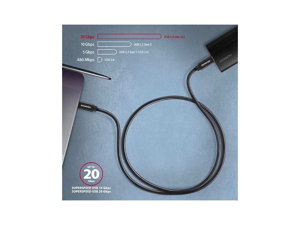 Prémiový propojovací USB-C <-> USB-C datový a nabíjecí AXAGON BUCM32-CM10AB SPEED+ USB 20Gbps (USB 3.2 Gen 2x2) kabel s konektory USB-C male na obou koncích. Kabel je navržen pro velmi rychlé datové přenosy, přenos videa a nabíjení notebooků, telefonů, tabletů a dalších mobilních zařízení výkonem až 100 W. Umožňuje také připojení monitorů, dokovacích stanic a externích SSD disků.