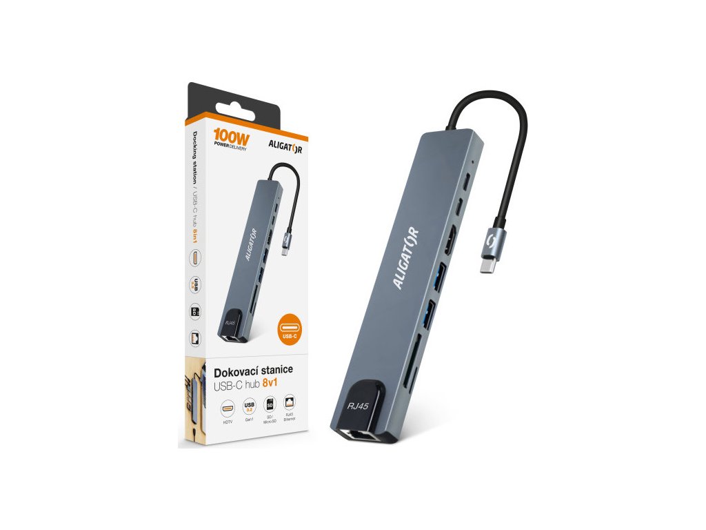 Aligator Dokovací stanice USB-C / Hub 8v1 (USB-C / 2xUSB / SD / MicroSD/ HDTV / RJ45)