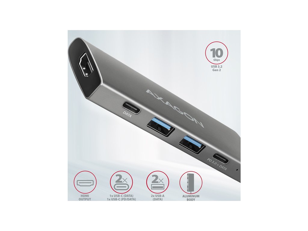 AXAGON HMC-5G21, USB 10Gb/s hub, porty 2x USB-A, 2x USB-C, HDMI 4k/30, PD 60W, kabel USB-C 13cm