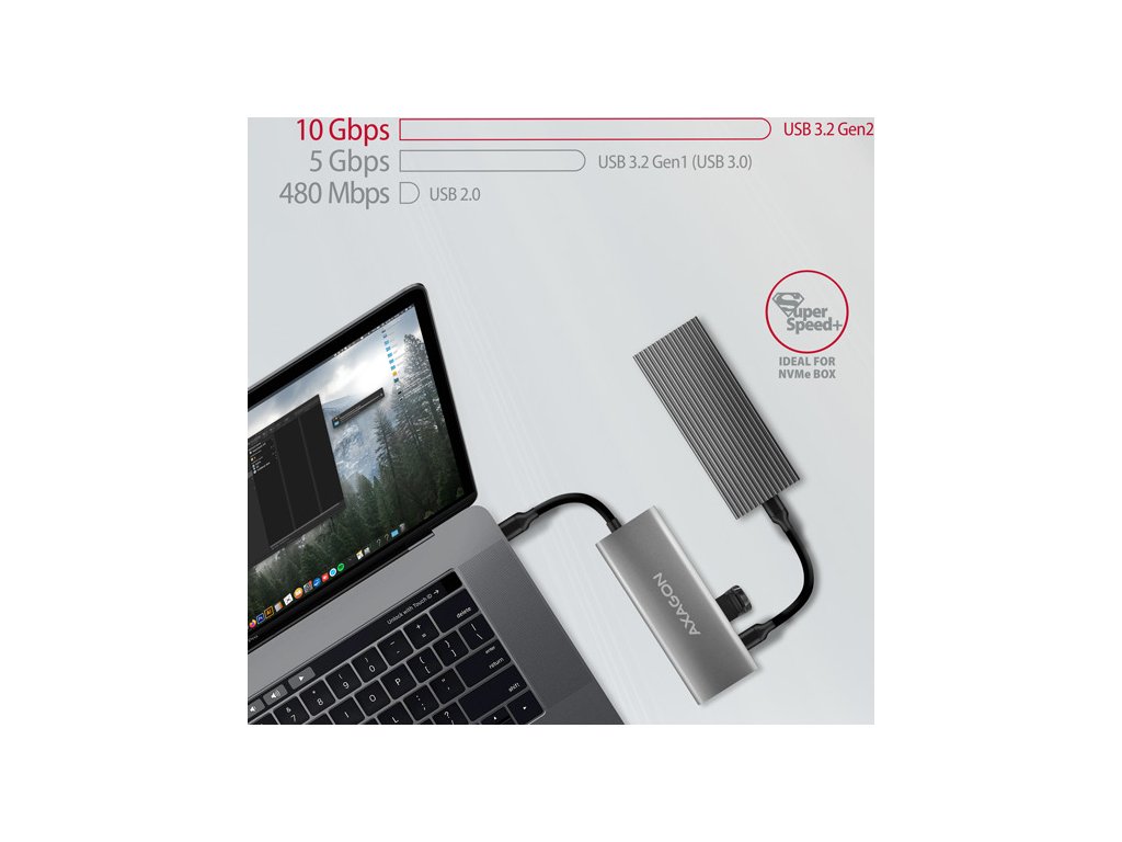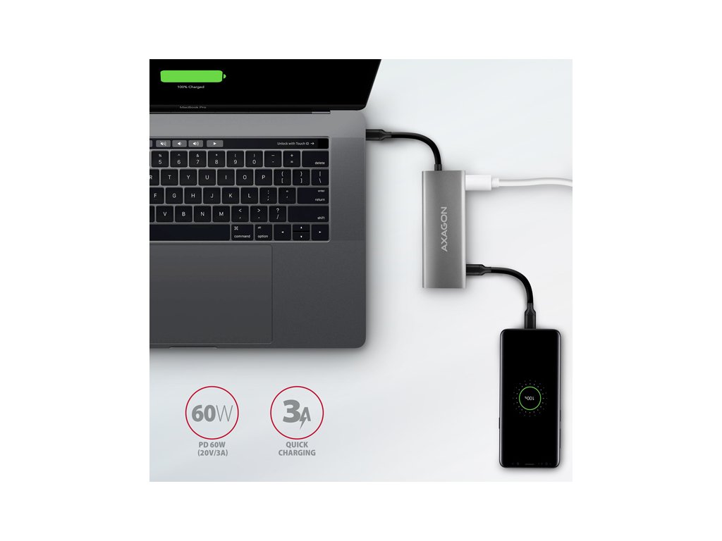 Dva USB-A 10Gbps výstupy umožňují připojení externích disků, flash disku, myši, tiskárny a dalšího USB příslušenství. USB porty také nabíjí mobilní telefony a tablety proudem až 1.5A. Hub je také vybaven kombinovaným USB-C portem, který může být použit pro přenos dat (USB 10Gbps), nebo pro nabíjení notebooku pomocí Power Delivery nabíječky. S využitím vhodné PD nabíječky tak napájíte nejen notebook, ale i samotný hub, s výkonem až 60W díky technologii Power Delivery 3.0.