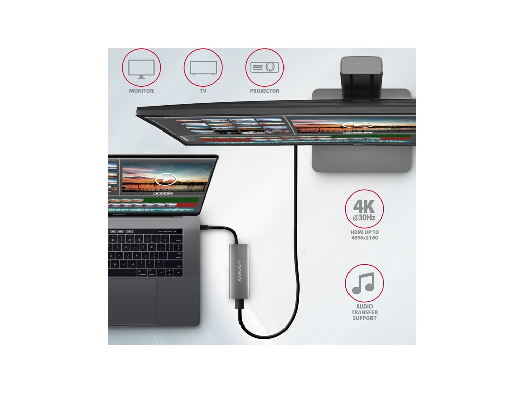 HDMI výstup umožňuje připojení externího monitoru, TV nebo projektoru s rozlišením až 4K/30Hz Ultra HD, 2K/60Hz Quad HD nebo 1080p/120Hz Full HD a přenos vícekanálového zvuku. Pro správné fungování video výstupu je nutné, aby notebook měl USB-C port s podporou DisplayPort Alternate Mode (DP Alt Mode) nebo port Thunderbolt 3 a výše.
