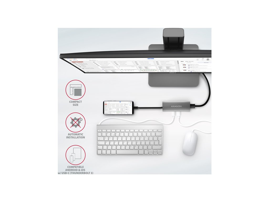 USB-C hub je ideálním doplňkem pro notebooky bez USB-A konektorů a video výstupu. Lze tak využít Vaše stávající USB periferie bez nutnosti pořizování nových. Díky funkcím Plug and Play a Hot Plug je samotné zapojení hubu velmi jednoduché bez složité instalace, a také lze jednoduše připojovat a odpojovat periferie za běhu počítače. Rozbočovač se nezalekne ani připojení k telefonům s USB-C konektorem. K telefonu tak připojíte například flash disk, klávesnici, myš, monitor, TV nebo projektor.