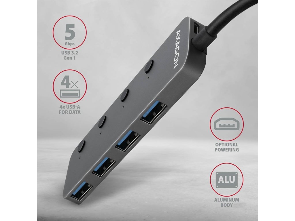AXAGON HUE-MSA, 4x USB 3.2 Gen 1 SWITCH hub, kovový, micro USB nap. konektor, kabel USB-A 20cm