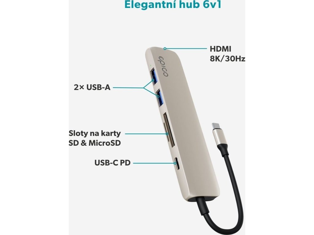 Epico 6in1 Aluminium Hub přináší elegantní řešení pro každodenní práci i multimediální využití. Díky šesti základním portům – HDMI, USB-C Power Delivery, dvěma USB-A a slotům na SD i MicroSD karty – získáte spolehlivé připojení pro všechna svá zařízení. HDMI port podporuje rozlišení až 8K/30Hz nebo 4K/120Hz, takže využijete plný potenciál monitorů s vysokým rozlišením. Hub navíc prostřednictvím HDMI portu zajišťuje precizní podání dynamického obrazu a zvuku díky technologii Dynamic HDR+ s až 12bitovou barevnou hloubkou a multikanálovým zvukem, včetně Dolby Atmos a DTS:X.